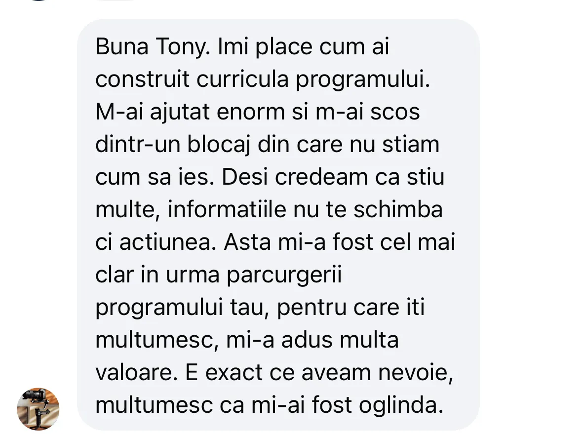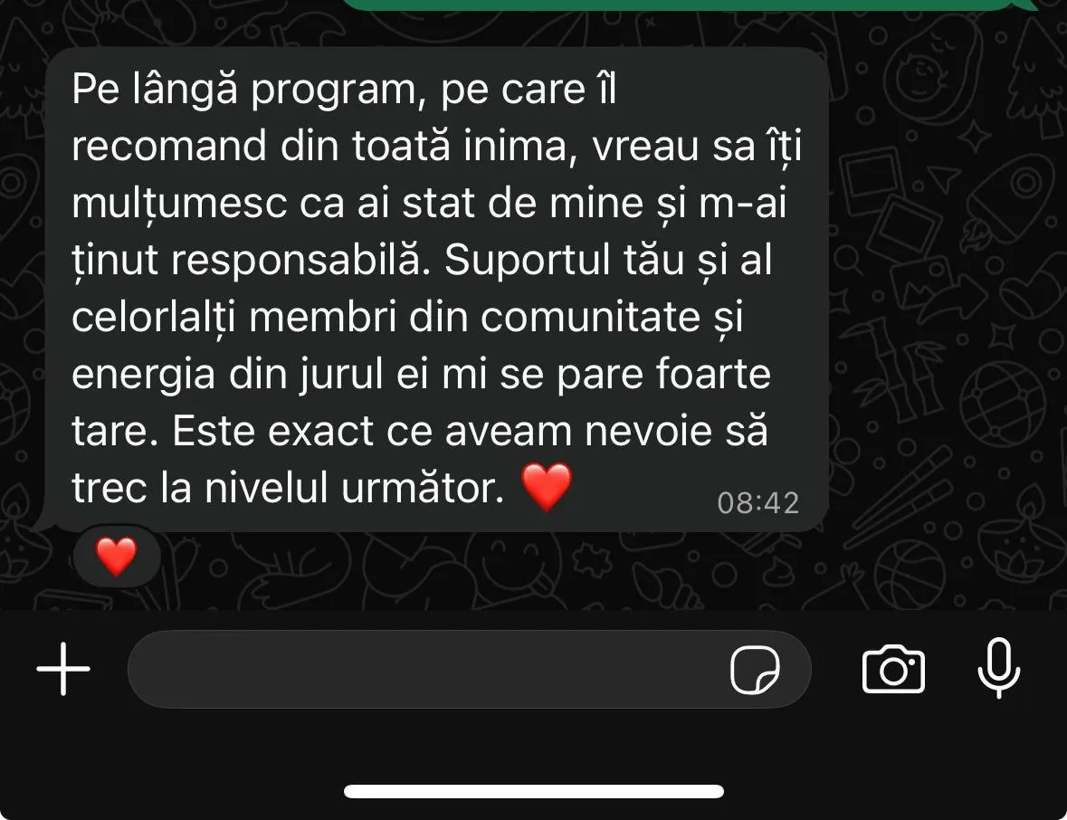 Sesiuni de Q&A săptămânale - Pui întrebări, primești feedback direct și eviți blocajele care apar de obicei când încerci să faci schimbări singur.